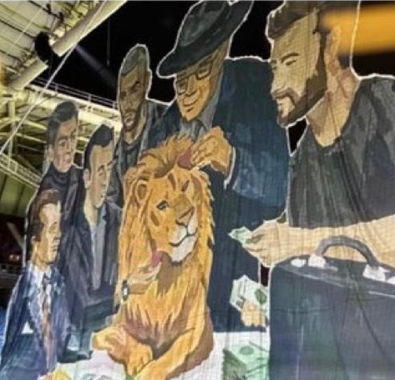 Trabzonspor taraftarı para ve aslan temalı koreografi ile “Parayı sportif değerler ve taraftarın üzerinde tutan bir yönetim anlayışı” vurgusu yapmak istiyor.